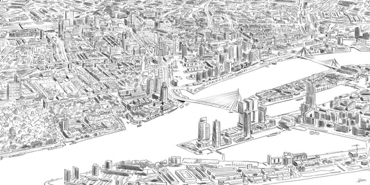De skyline van Rotterdam is altijd in beweging. Wolkenkrabbers, bruggen en reflecties in het water vormen een krachtig stadsbeeld. Deze zwart-wit posters vangen de dynamiek en architectuur in heldere, contrastrijke composities.